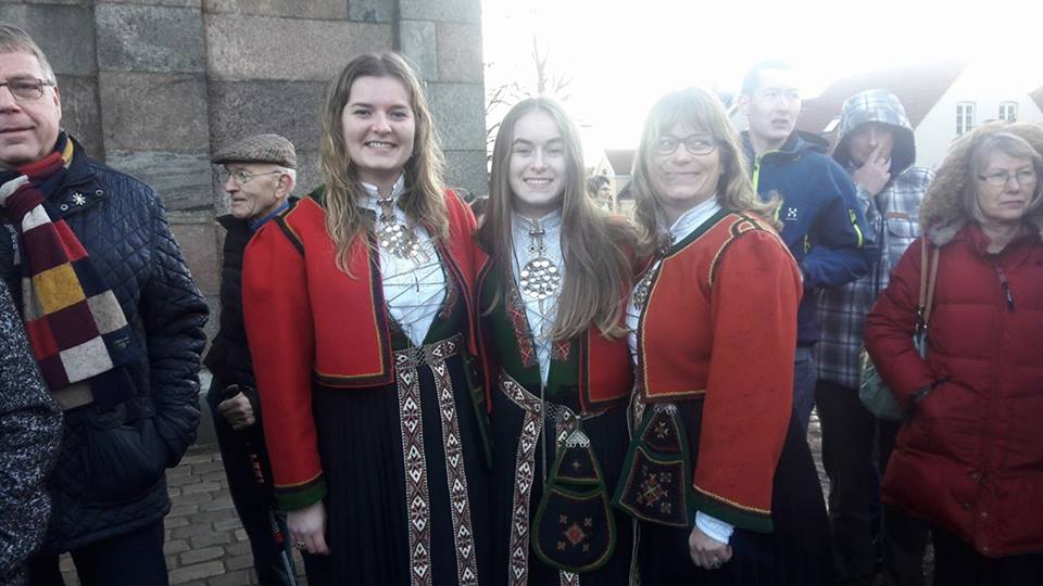 Tre piger, der var klædt i Norsk nationaldragt, trodsede regnen i højt humør sammen med de mange, der stod i kø.