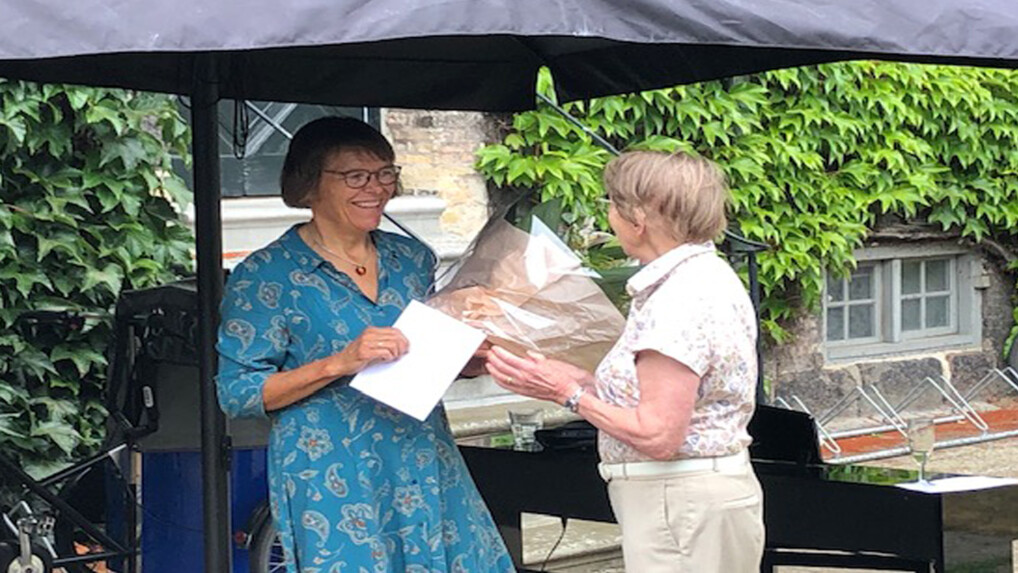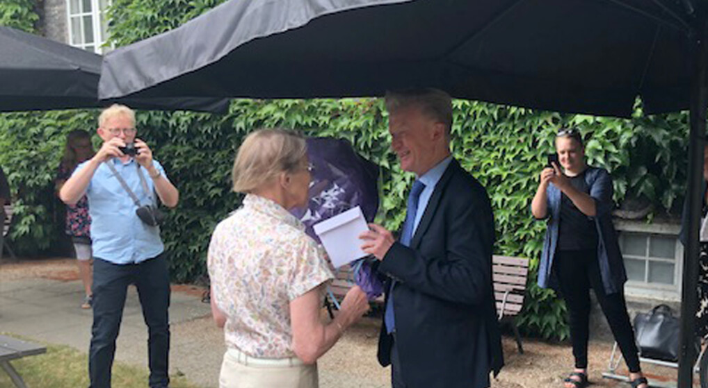 Lisbeth Smedegaard Andersen fra fondsbestyrelsen overrækker blomster til Mads Bille.