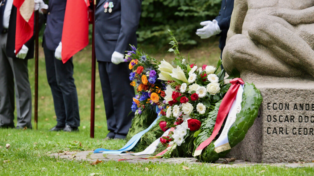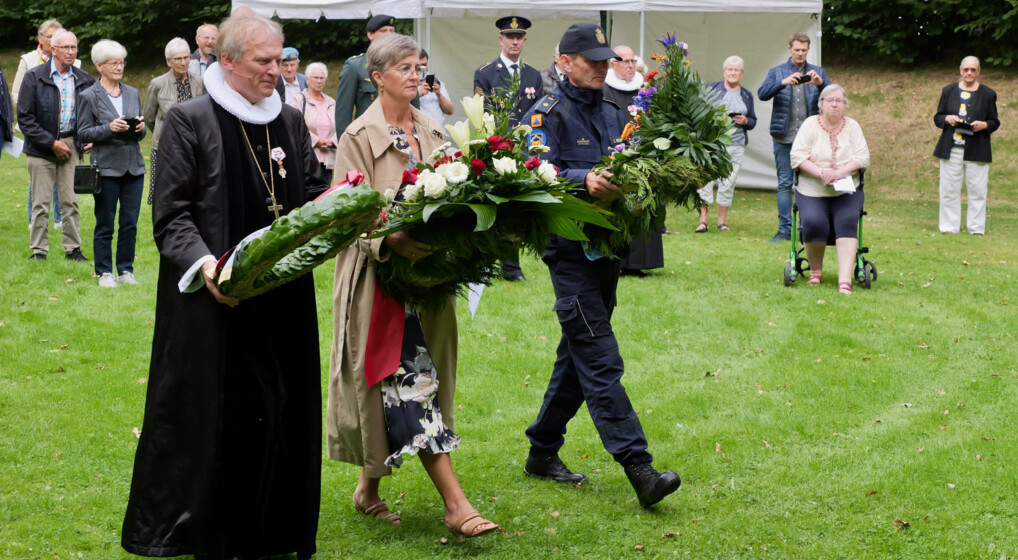 Biskop Henrik Stubkjær, Borgmester Dorte West og en repræsentant fra beredskabet nedlagde kranse ved monumentet i Mindeparken i Herning.