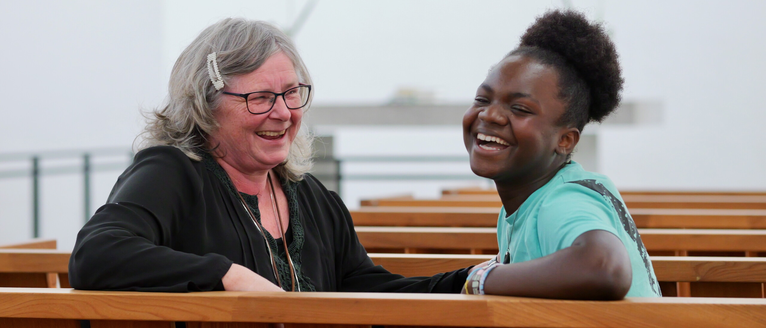 De fniser, som var de to teenagere, der talte om hemmelige kæresterier eller nyeste mode - men i virkeligheden er de bare glade for endelig at se hinanden igen. Et enkelt blik fra den ene til den anden, og man mærker den gensidige begejstring over venskabet. Et venskab, der spreder varme og en smittende energi her i sognegården i Gullestrup Kirke.