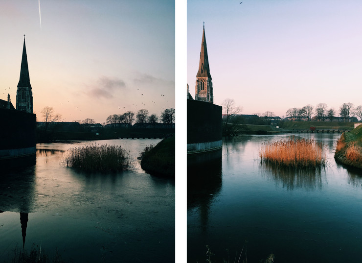 Lyset er bedst først og sidst på dagen. Her St Alban's ved Kastellet fotograferet en vinteraften og den følgende morgen. (iPhone SE)