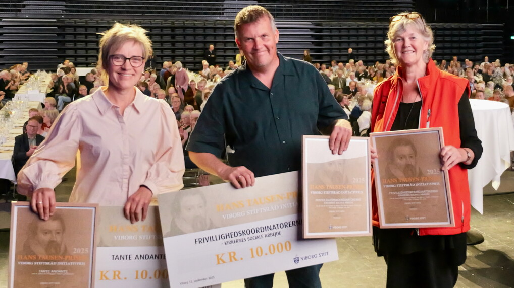 Prisvinderne til årets stiftsmenighedsrådsstævne. Fra venstre Elin Engholm Knudsen (Tante Andante) og Lars Kristensen og Kirsten Vindum på vegne af frivillighedskoordinatorerne i Kirkernes Sociale Arbejde i Viborg Stift.